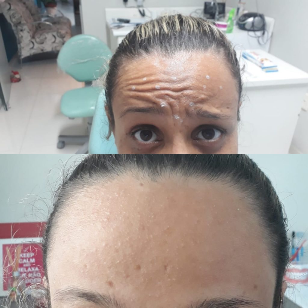 O resultado começa aparecer 48h após aplicação tendo seu pico após 14 dias, e dura de 4 a 6 meses. Ela é contra indicada para pacientes que apresentem alergia aos componentes da fórmula da toxina botulínica; Mulheres grávidas; Mulheres lactantes (que estejam amamentando); Pacientes com doenças neuromusculares.